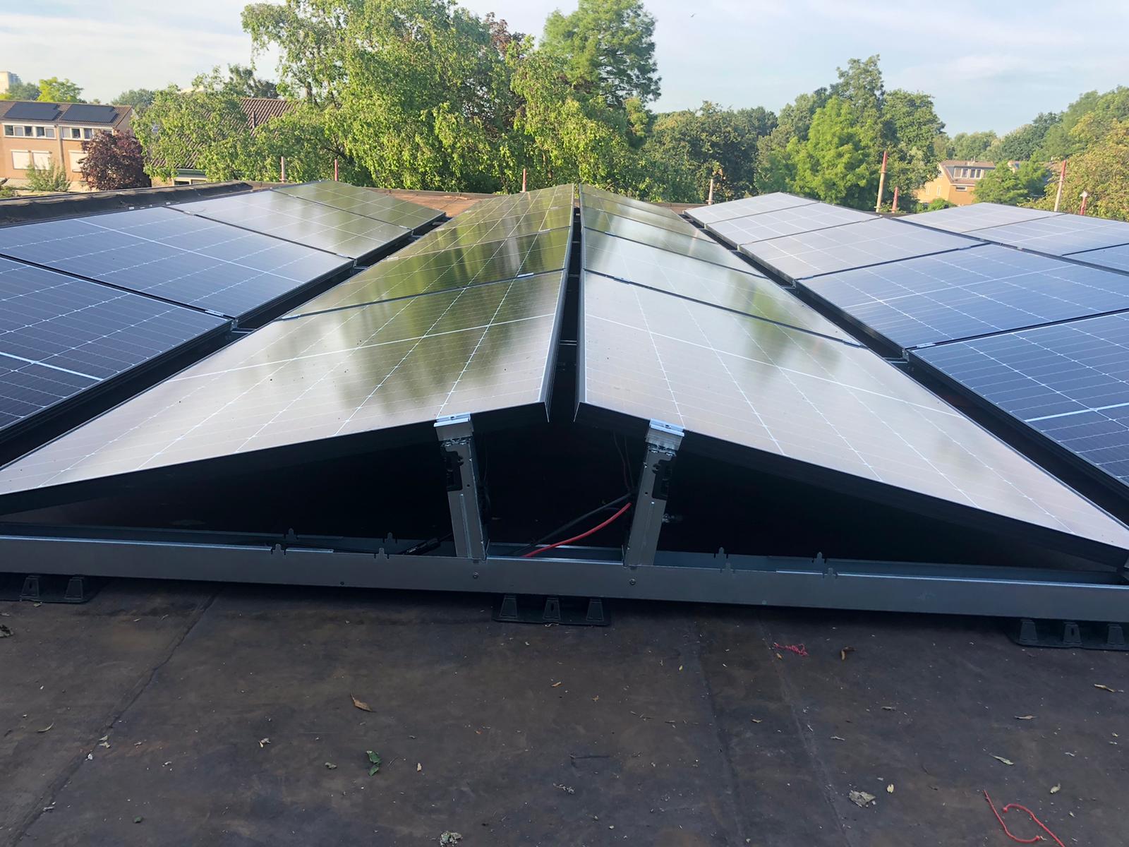 Installatie van 82 hoogwaardige zonnepanelen op het bedrijfsdak (totaal vermogen: 30 kWp).